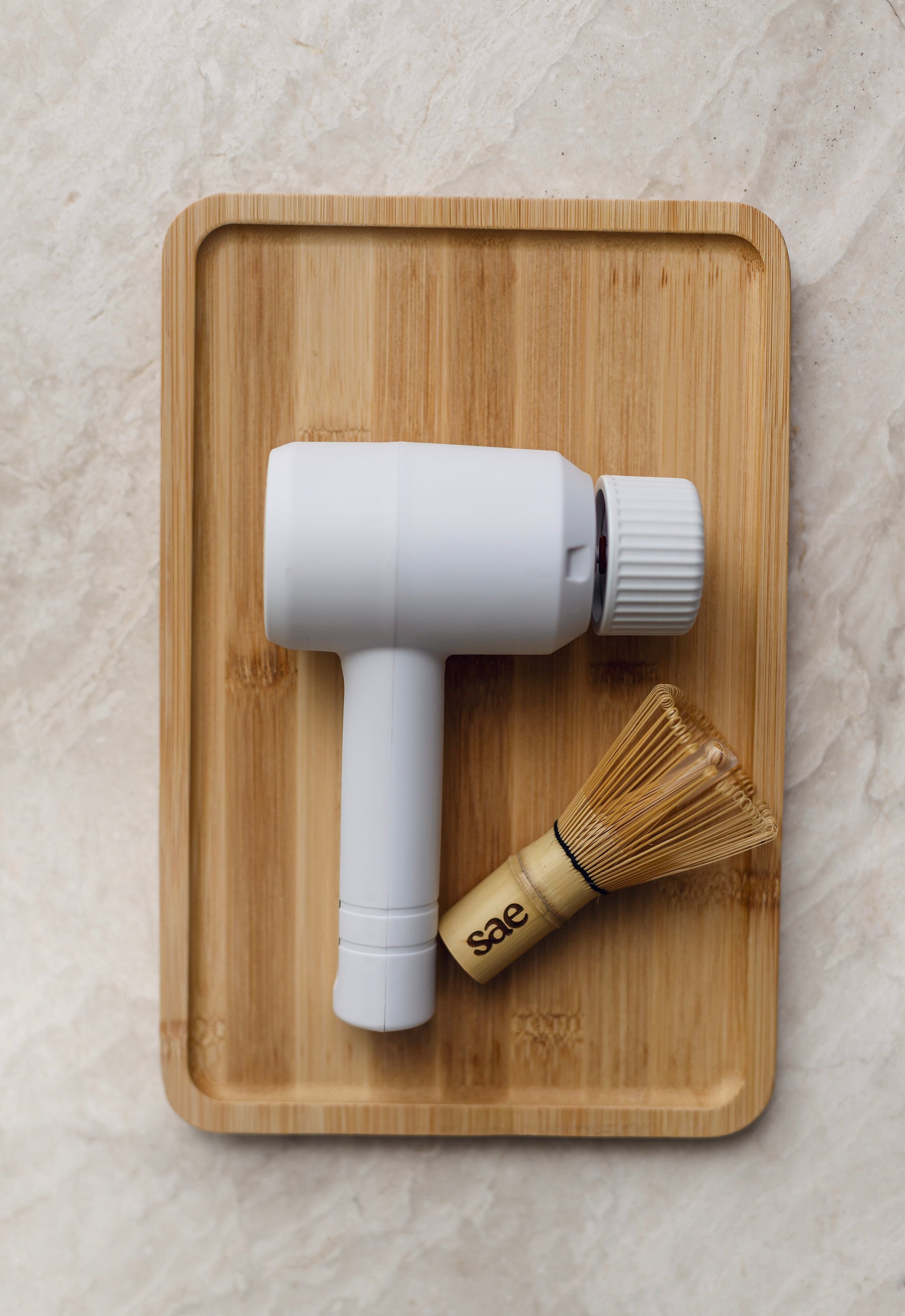 this sleek device holds your bamboo whisk and powers it to whisk your matcha into a perfectly smooth, frothy cup